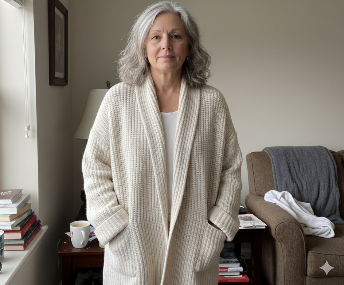 I was pleasantly surprised by how soft and cozy this coat feels. The fit is just right for me, and the sleeves are a nice length too. It has a relaxed look but still feels elegant enough to wear out. I’ve already had compliments on it!"